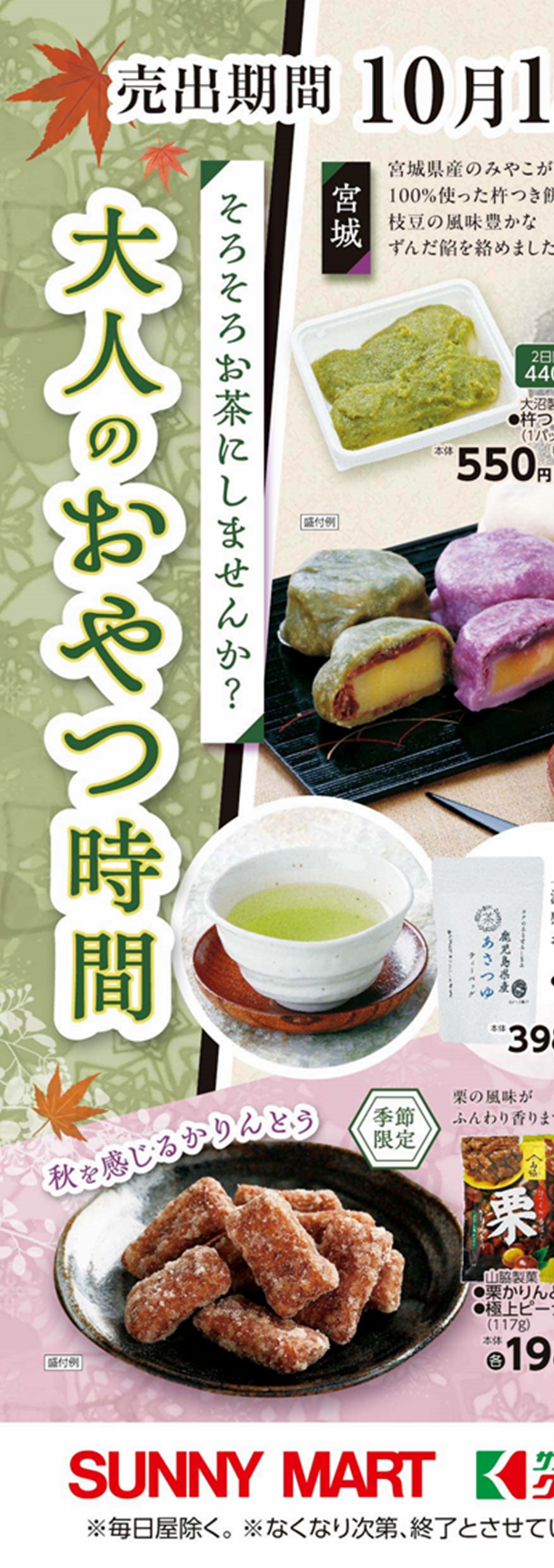 SUNNY MART 売出期間 2025年 10月15日(水)~10月16日(木)「そろそろお茶にしませんか?大人のおやつ時間♪」LINE