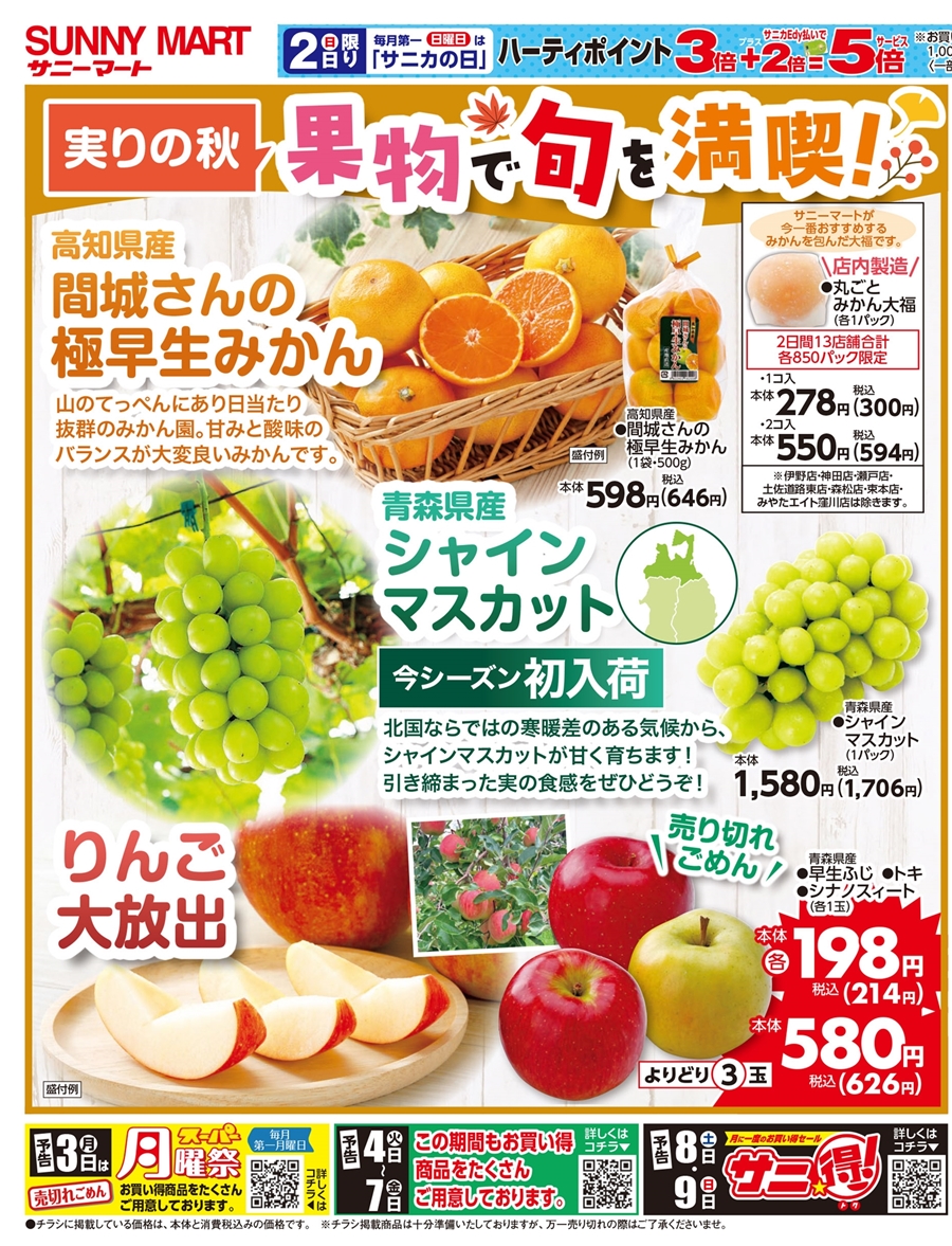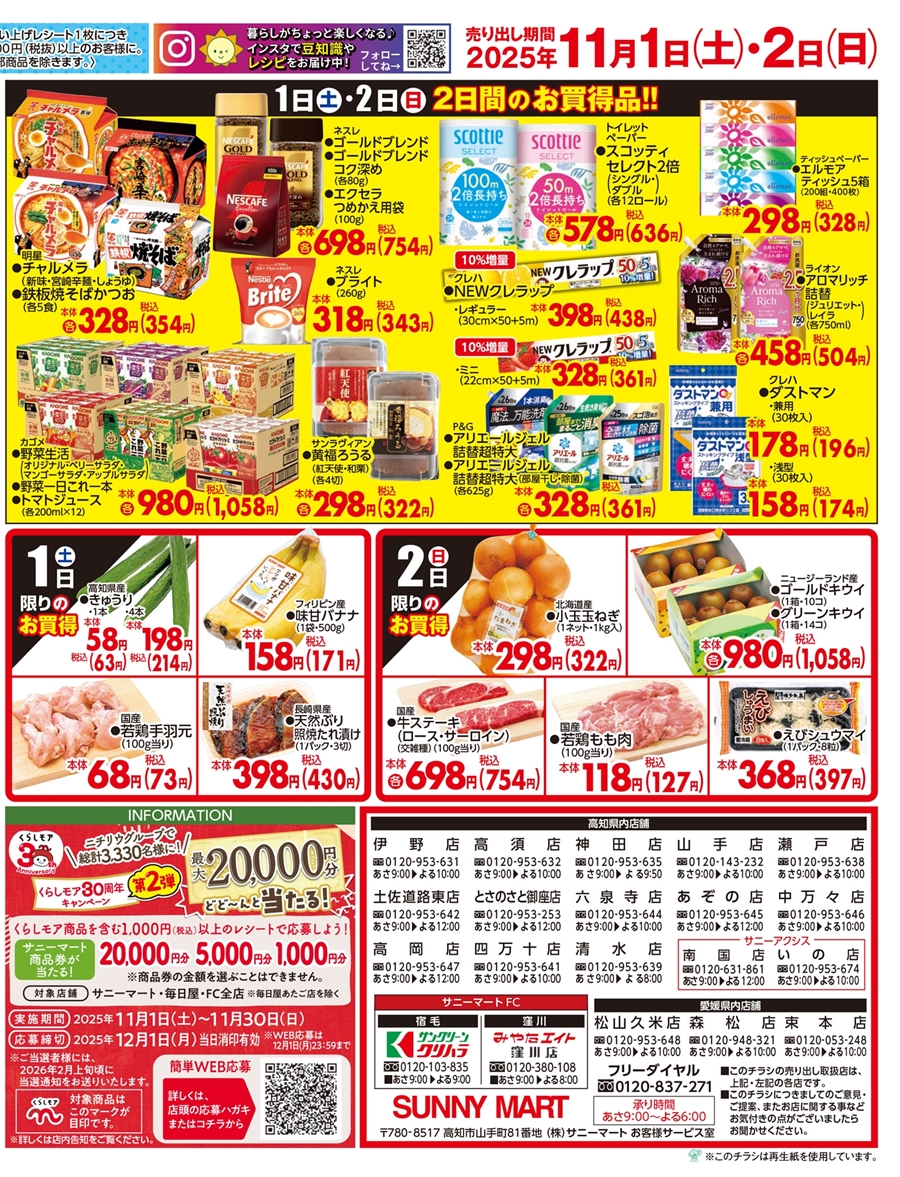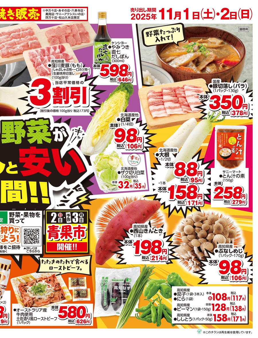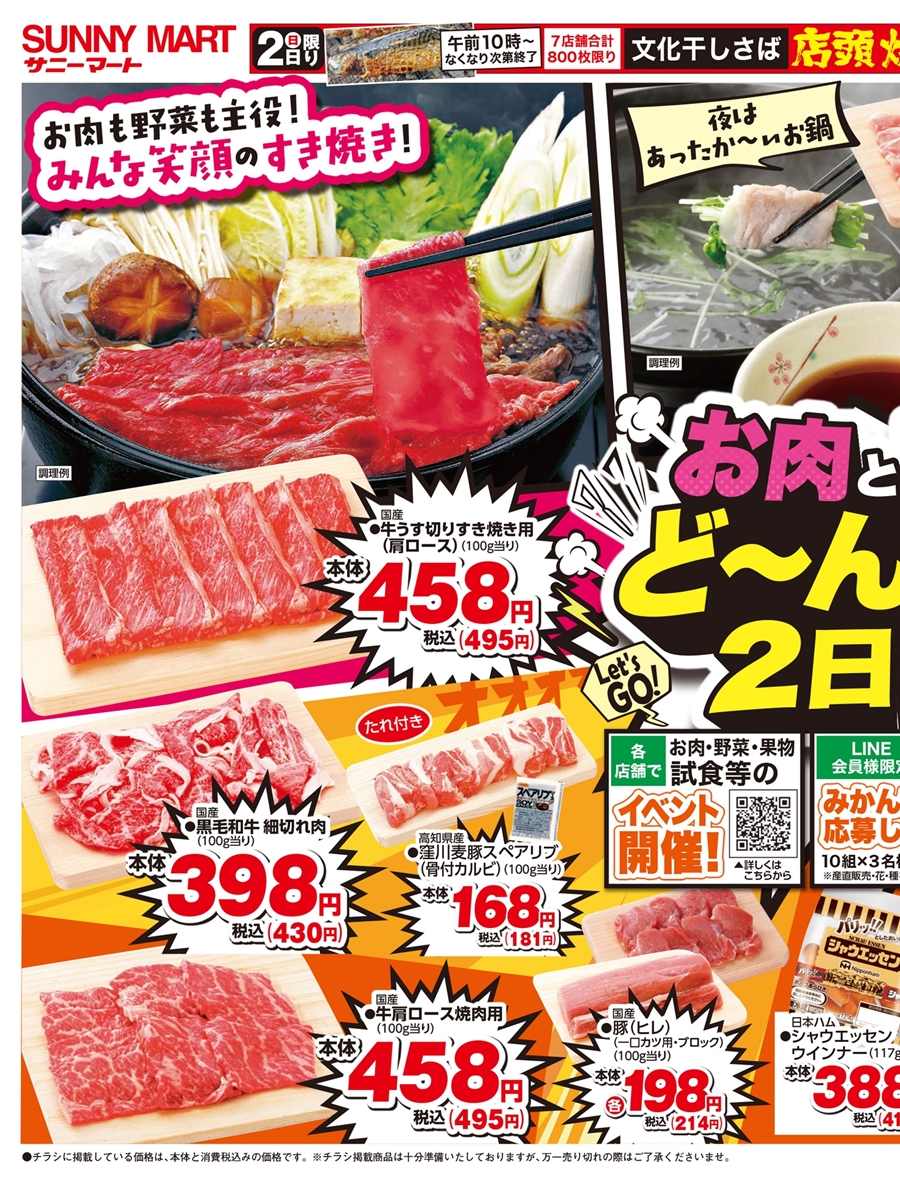 SUNNY MART 2025年 11月1日(土)〜11月2日(日)チラシ「お肉と野菜がど~んと安い2日間!」インスタ
