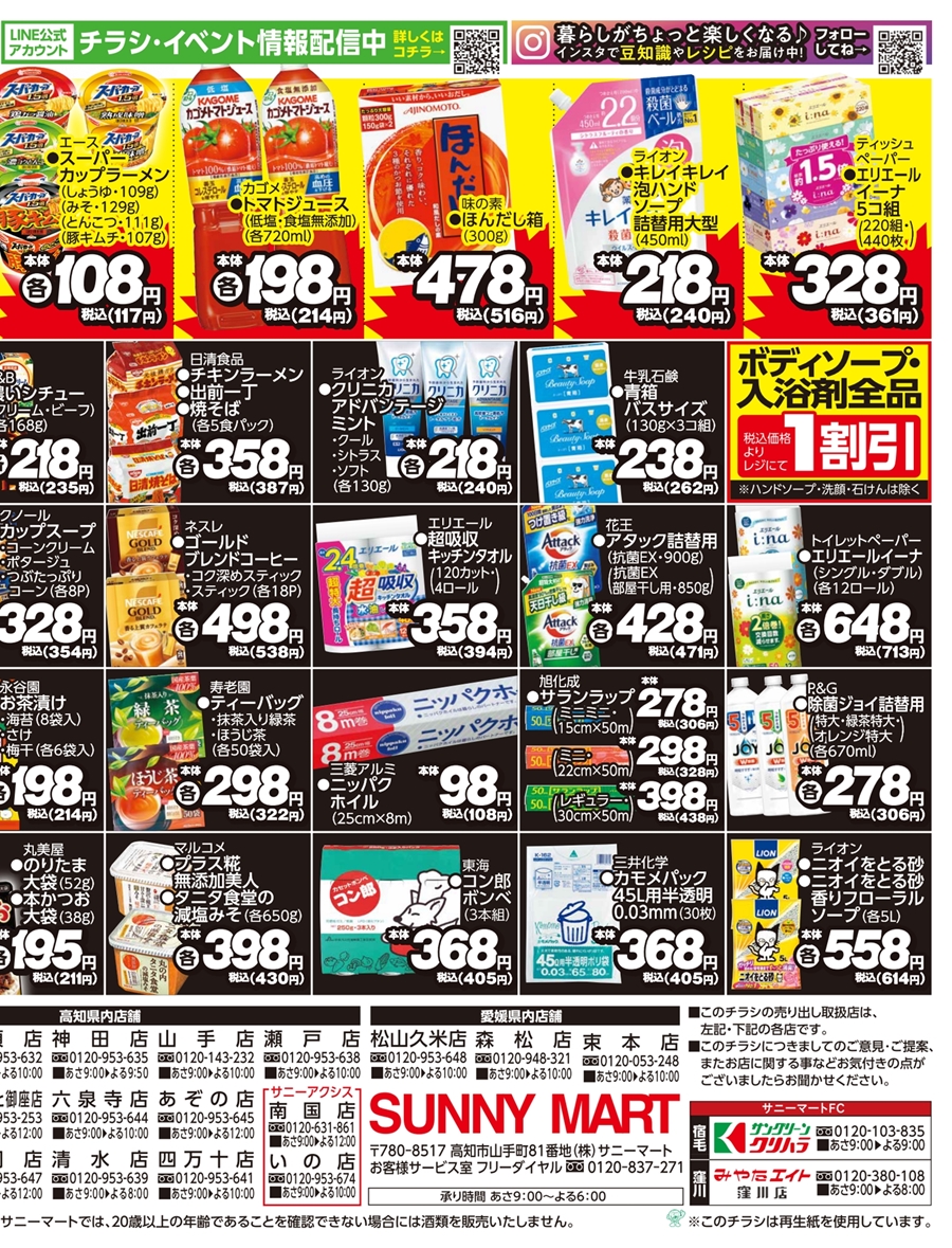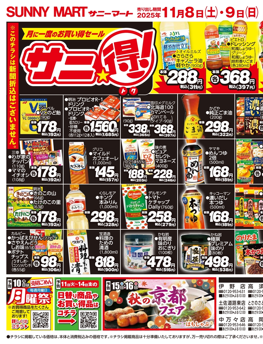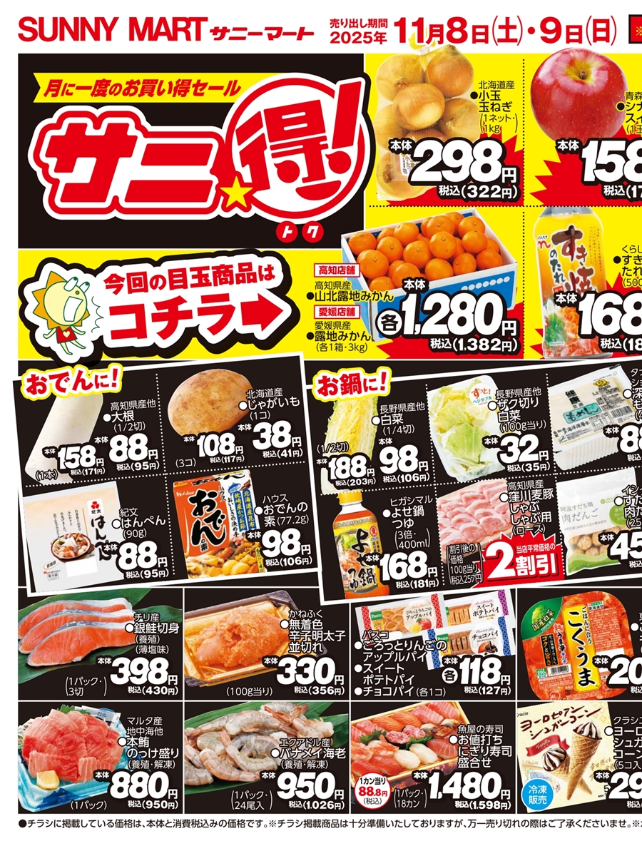 SUNNY MART 2025年 11月8日(土)〜11月9日(日)チラシ「月に一度のお買い得セール♪サニ得」インスタ