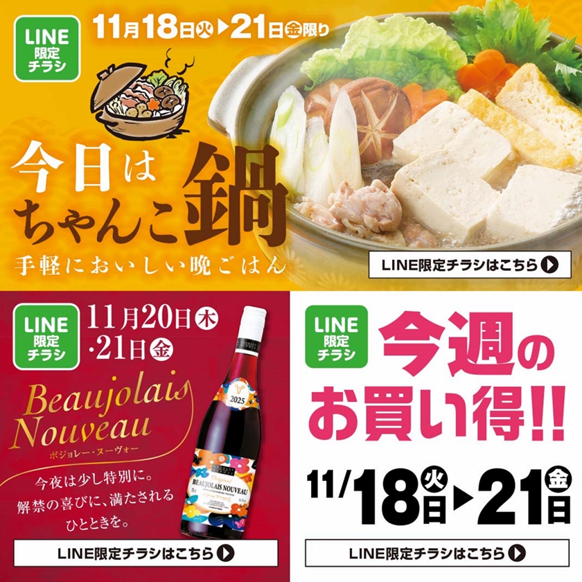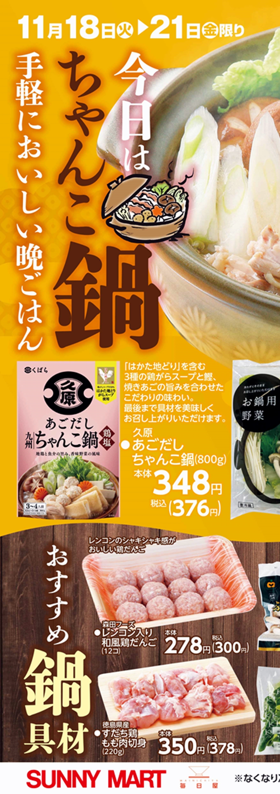 SUNNY MART 売出期間 2025年 11月18日(火)~11月21日(金)「手軽においしい晩ごはん!今日はちゃんこ鍋♪」LINE