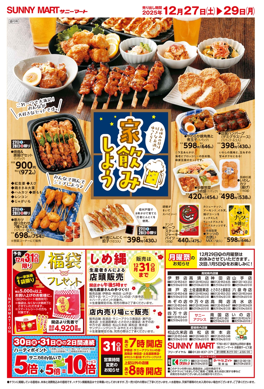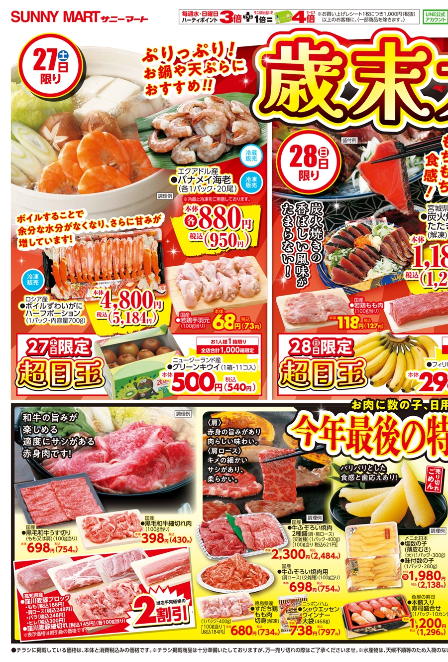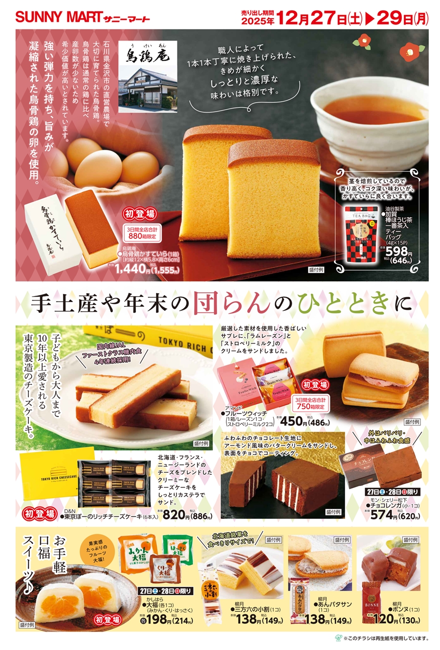 SUNNY MART 2025年 12月27日(土)〜12月29日(月)チラシ「手土産や年末の団らんのひとときに♪&歳末大市!」インスタ