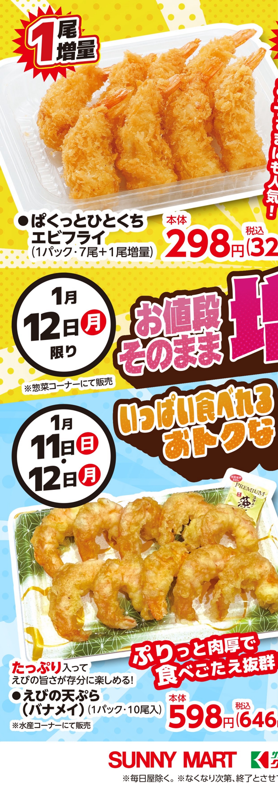 SUNNY MART売出期間 2026年 1月11日(日)〜1月12日(月) 「お値段そのまま増量!&いっぱい食べれるおトクな大盛!」LINE