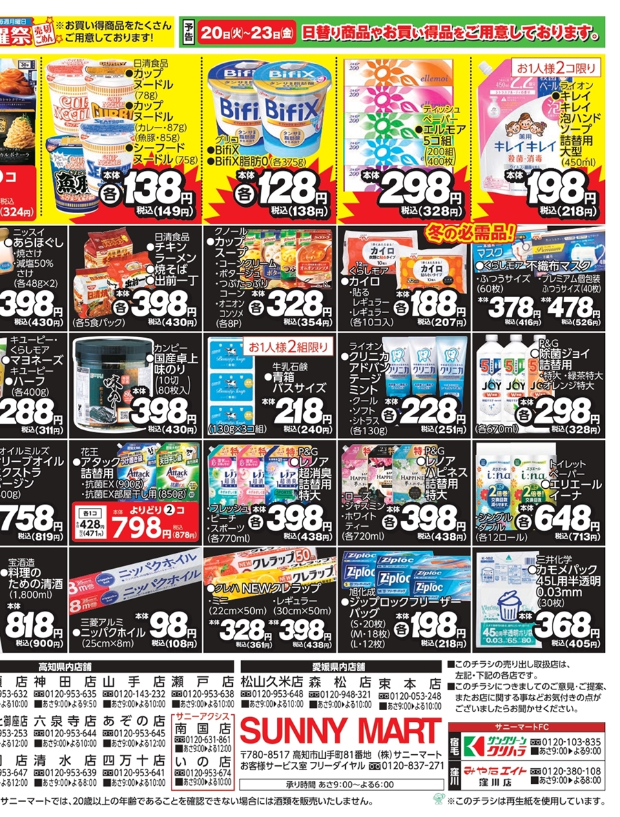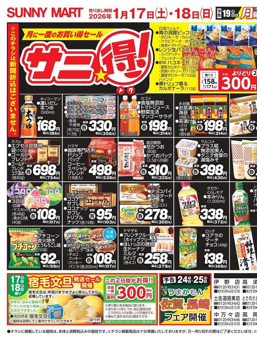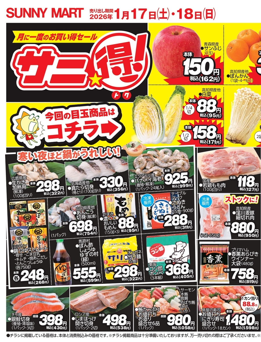SUNNY MART 2026年 1月17日(土)〜1月18日(日)チラシ「月に一度のお買い得セール♪サニ得!」LINE
