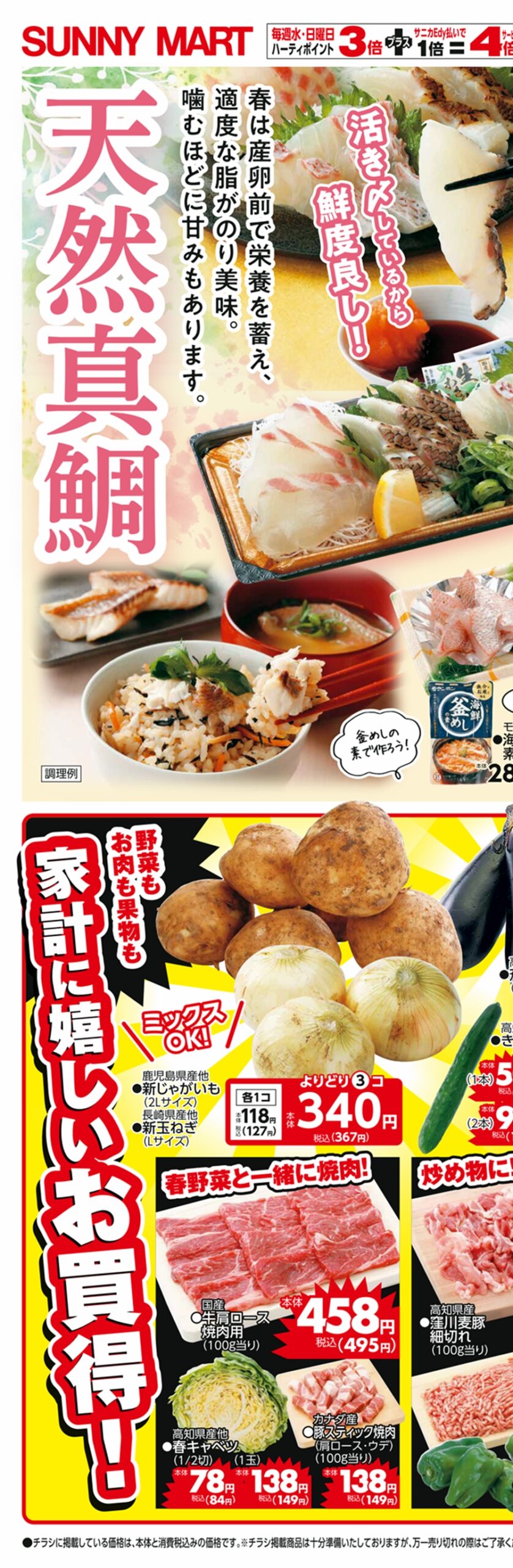 SUNNY MART 2026年 3月7日(土)〜3月8日(日)チラシ「野菜&お肉がお買い得!盛り盛りDAY!&鮮度良し!天然真鯛」