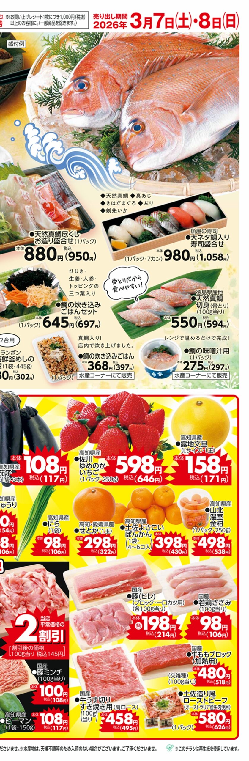 2. SUNNY MART 2026年 3月7日(土)〜3月8日(日)チラシ「野菜&お肉がお買い得!盛り盛りDAY!&鮮度良し!天然真鯛」