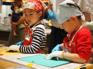 お魚コーナーでは、アジの3枚おろしを体験しました。水産の大石リーダーが上手に教えてくれました♪