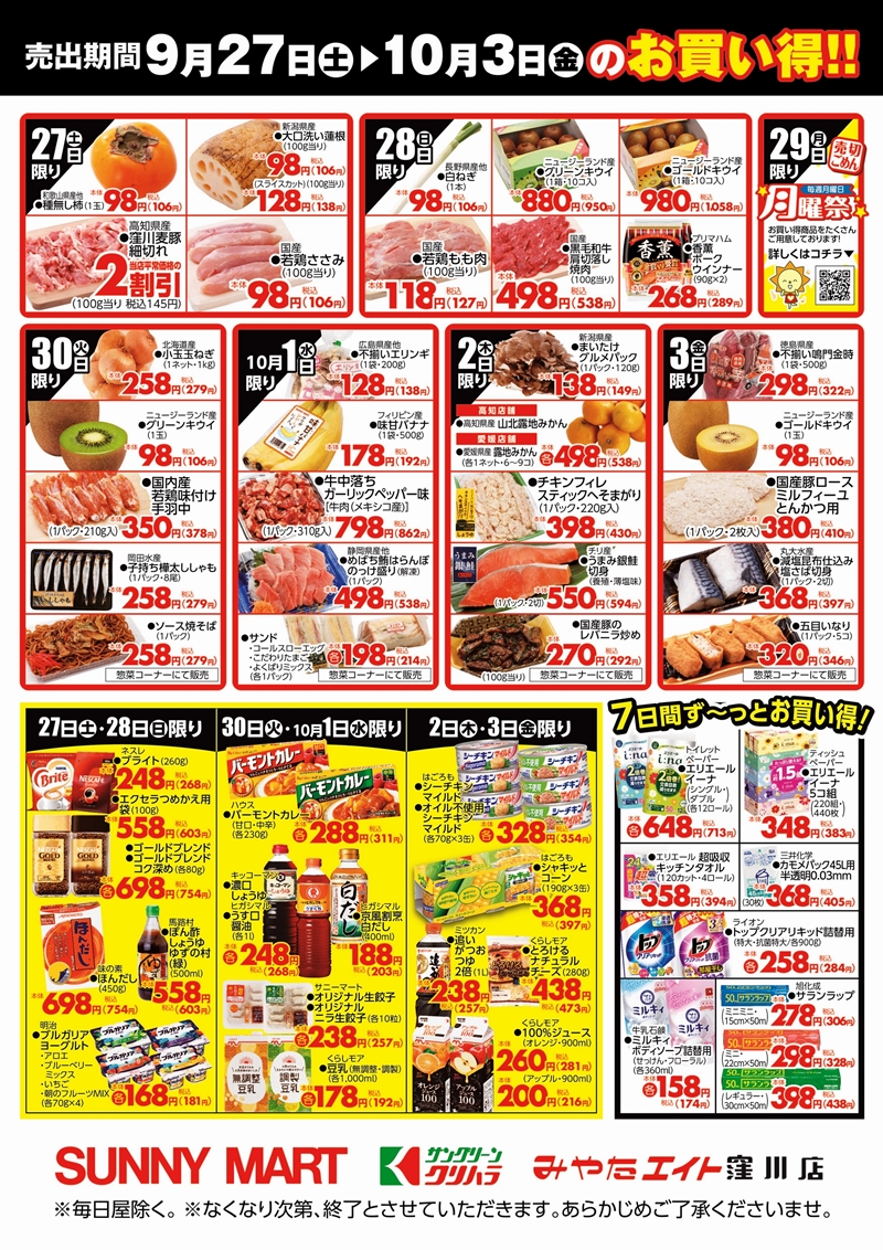 SUNNY MART 2025年 9月30日(火)~10月3日(金) 日替り商品がお買い得♪