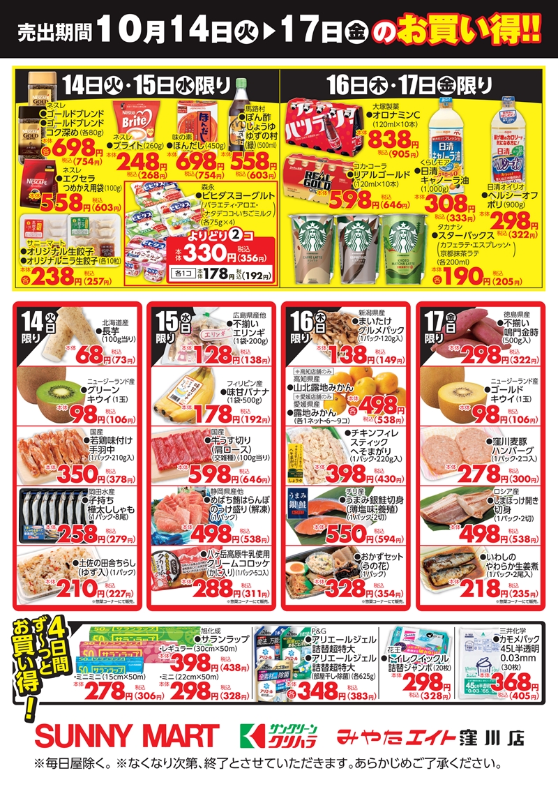 SUNNY MART 2025年 10月14日(火)~10月17日(金) 日替り商品がお買い得♪