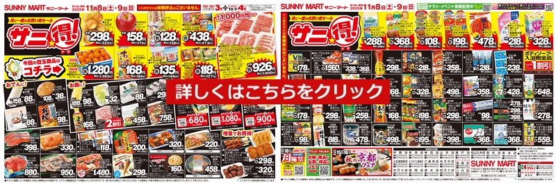 2025年11月7日 / 最終更新日時 : 2025年11月7日 クー コーポレーション 新着情報 SUNNY MART 2025年 11月8日(土)〜11月9日(日)チラシ「月に一度のお買い得セール♪サニ得」