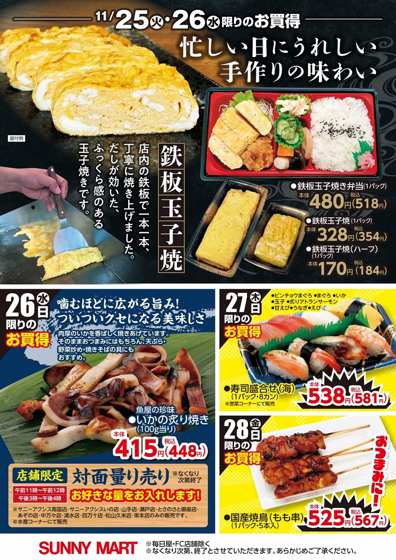 2025年11月25日 / 最終更新日時 : 2025年11月25日 クー コーポレーション 新着情報 SUNNY MART 売出期間 2025年 11月25日(火)~11月28日(金)「日替りのお買い得!」