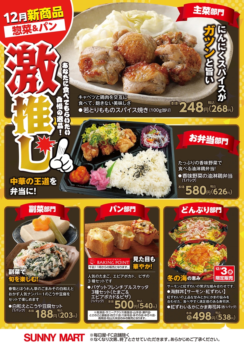 SUNNY MART 12月新商品☆「惣菜&パン」あなたに食べてもらいたい自慢の逸品!