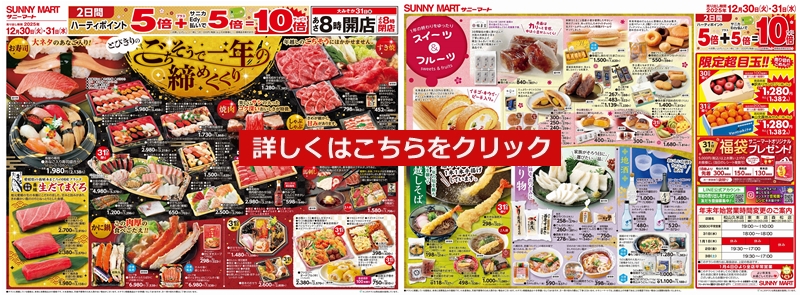2025年12月29日 / 最終更新日時 : 2025年12月29日 クー コーポレーション 新着情報 SUNNY MART (愛媛エリア) 2025年 12月30日(火)〜12月31日(水)チラシ「とびきりのごちそうで一年の締めくくり♪」