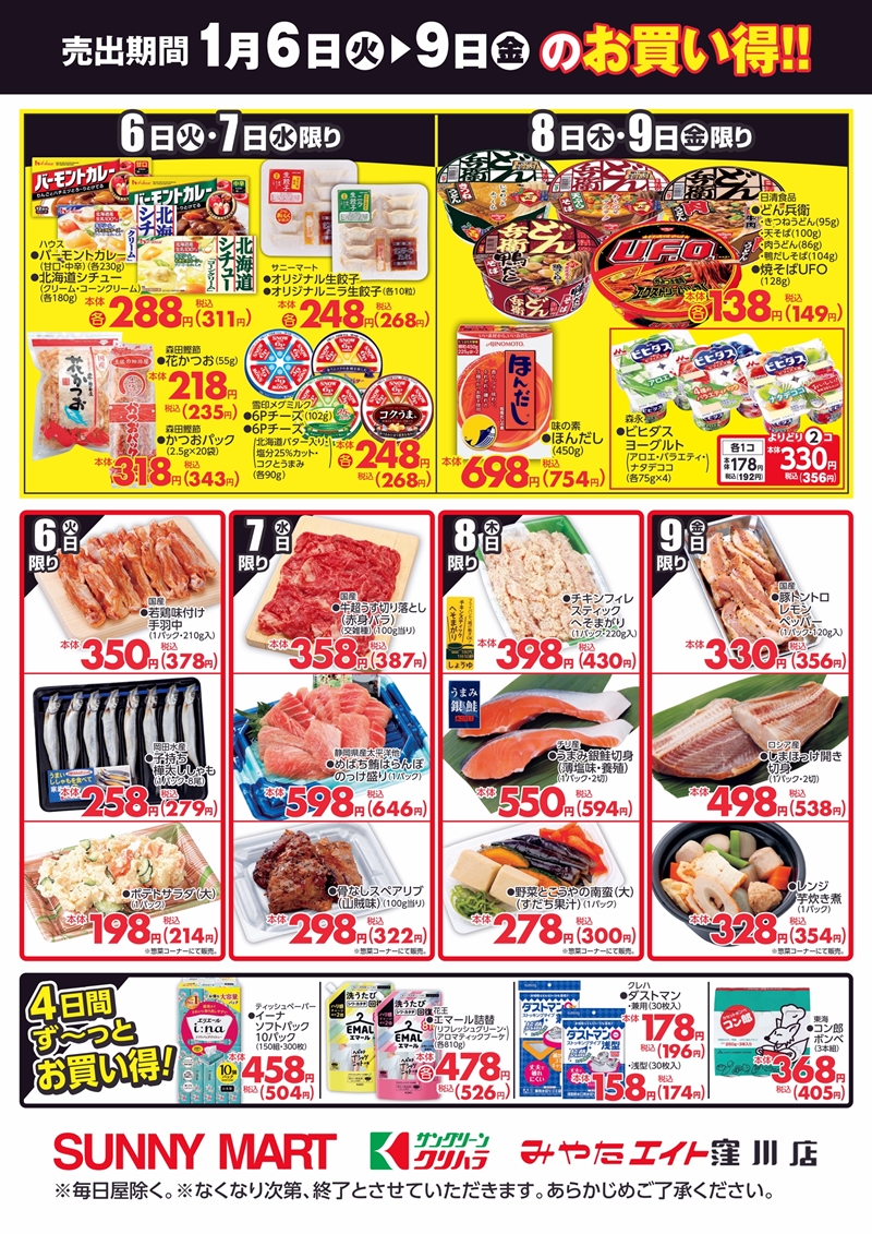 SUNNY MART 2026年 1月6日(火)~1月9日(金) 日替り商品がお買い得♪