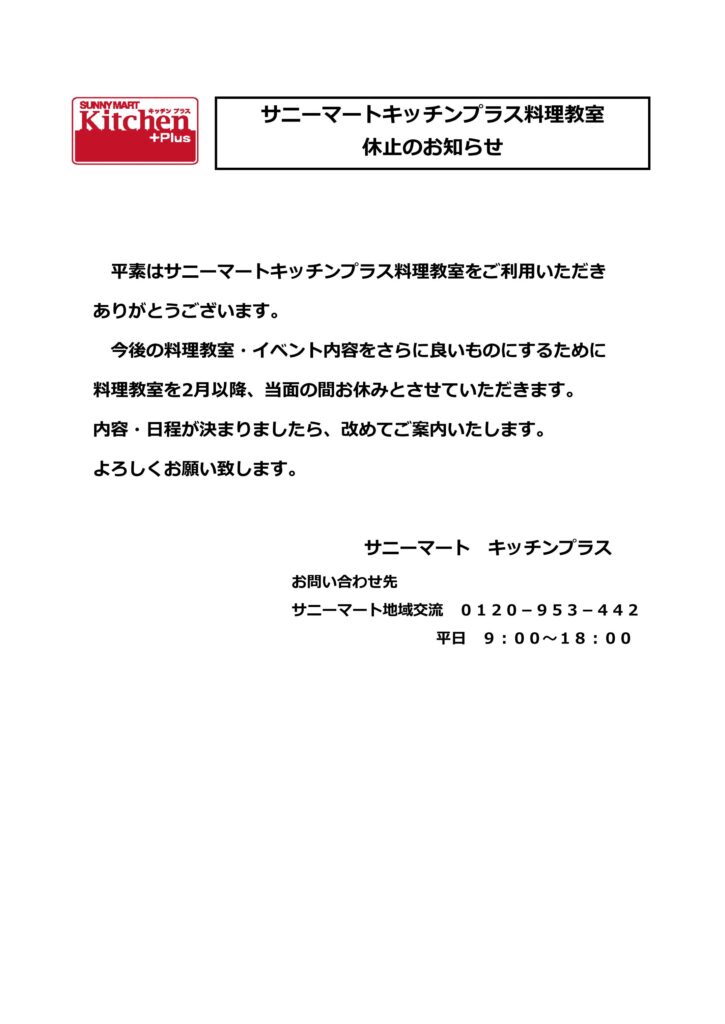 2026年2月2日 / 最終更新日時 : 2026年2月2日 サニーマートCR CR活動 サニーマートキッチンプラス料理教室休止のお知らせ 日頃よりご愛顧いただきありがとうございます。 今後の料理教室・イベント内容をさらに良いものにするために、教室を一旦休止させていただき準備をいたします。 内容・日程が決まりましたら、改めてご案内いたします。 よろしくお願いいたします。