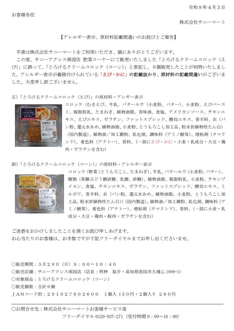 2026年4月3日 / 最終更新日時 : 2026年4月3日 クー コーポレーション 新着情報 表示記載間違いのお詫び「とろけるクリームコロッケ」 サニーアクシス 南国店の惣菜コーナーで販売致しました「とろけるクリームコロッケ(えび)」に誤って、「とろけるクリームコロッケ(コーン)」と表記、販売したことが判明いたしました。 アレルギー表示が義務付けられている「えび・かに」の記載抜かり、原材料の記載間違いがございました。 ご迷惑をおかけし大変申し訳ございません。