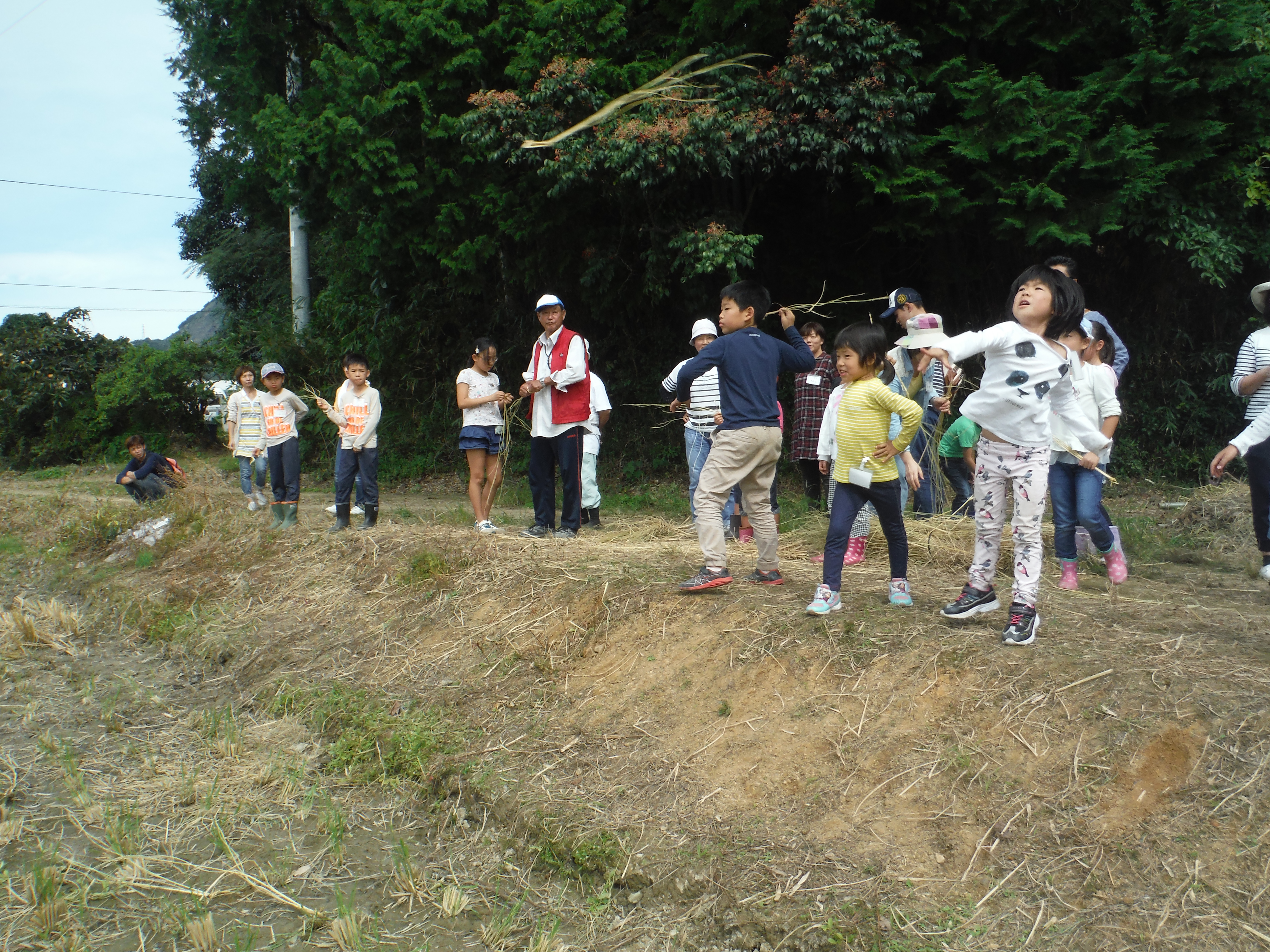 お肉を堪能したあとは「稲わら飛ばし大会」を開催!脱穀したあとのわらを遠くに飛ばした子が勝ちのシンプルなルール!